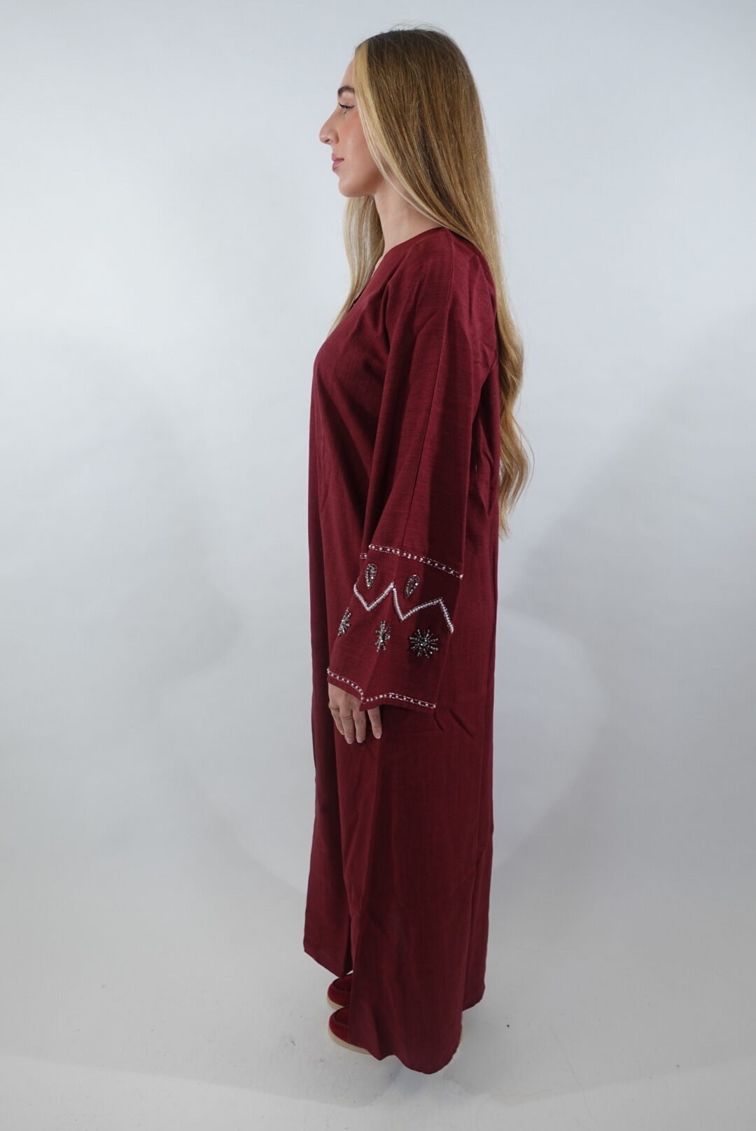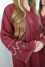 Abaya ouverte avec boutons de pression au tissu fluide et léger, offrant un tombé élégant. Les poignets des manches sont délicatement ornés de perles, ajoutant une touche chic et raffinée. Une pièce sobre et élégante, parfaite pour toutes les occasions