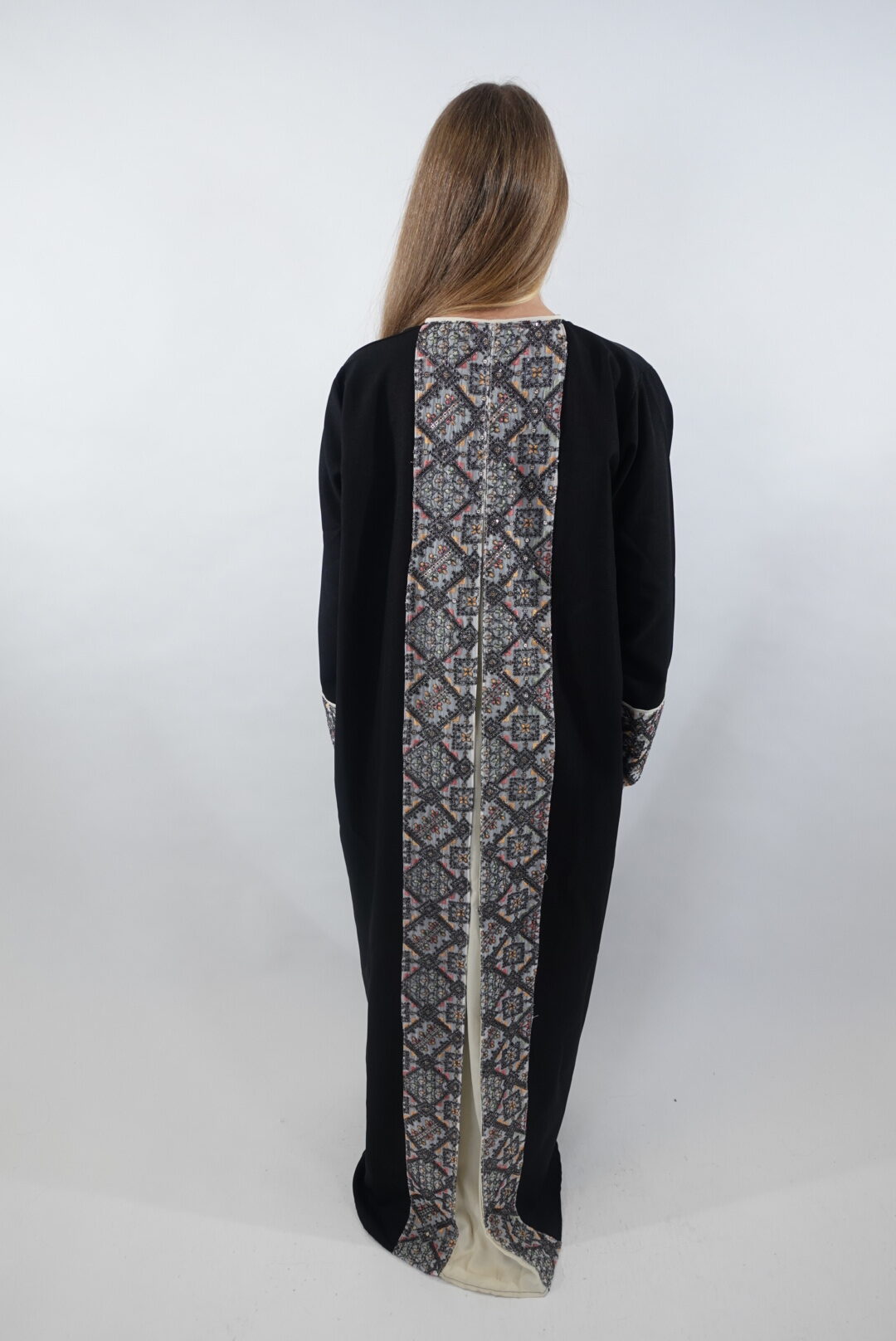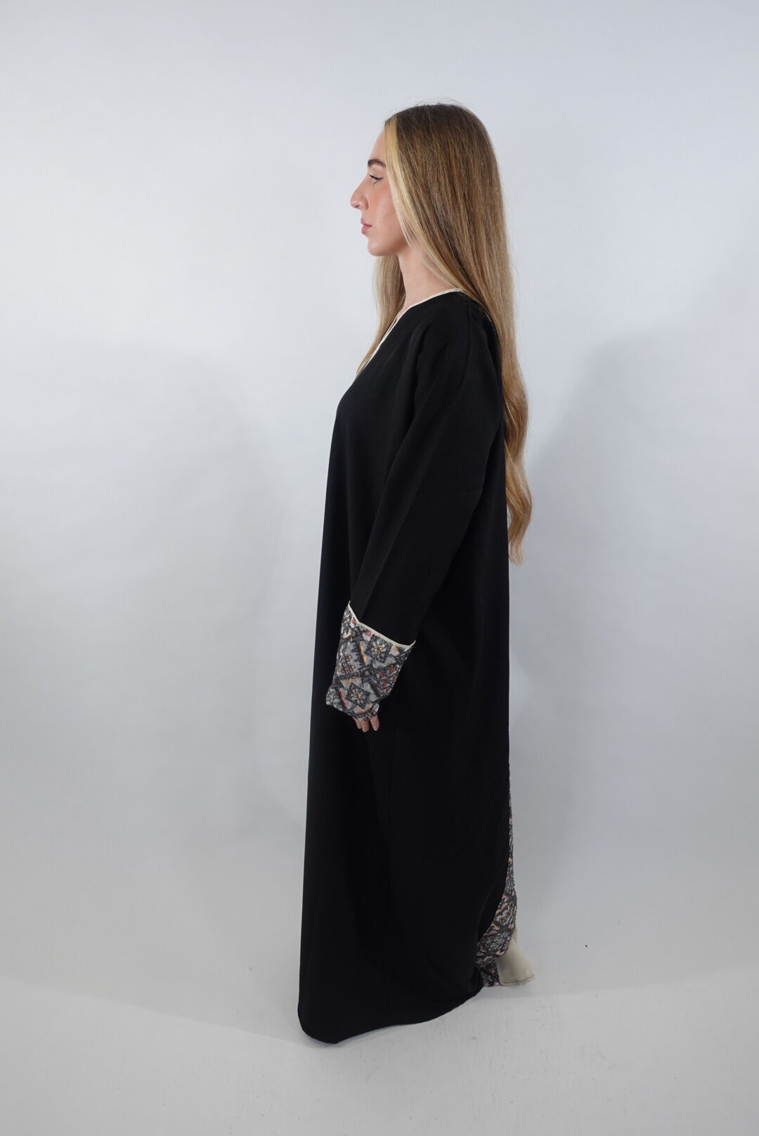 Robe noire fluide avec insert beige et motifs d’inspiration orientale.